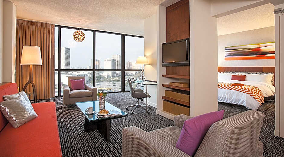 This suite includes floor-to-ceiling windows overlooking the Galleria or Downtown. A living room with sofa bed, flat-screen TV, and a private balcony are included. Extras include an office alcove and bar.